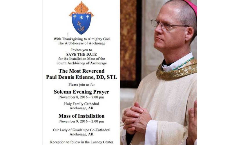 The newly appointed Archbishop of Anchorage, Bishop Paul Etienne, will be formally installed on Nov. 9 at 2 p.m. at Our Lady of Guadalupe Co-Cathedral in Anchorage. A solemn evening of prayer will proceed the installation on Nov. 8, 7 p.m., at Holy Family Cathedral in Anchorage. The public is invited to attend these events.