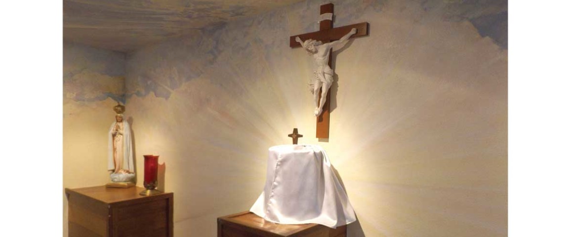 She spent nearly two months transforming the little chapel of the K-12th grade school. Located on the school grounds, the chapel is a converted small split-level house complete with an attached carport. Its understated green and grey exterior opens into to a rich setting with a marble altar central.