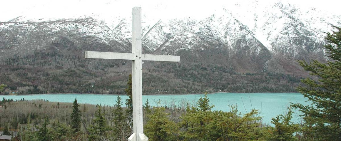 In addition to the cemetery, the chapel mission also contains an outdoor stations of the cross situated along a path leading to the peak of a mountain foothill. At the top, a six-foot-tall white cross overlooks a sweeping view of the Kenai River valley.