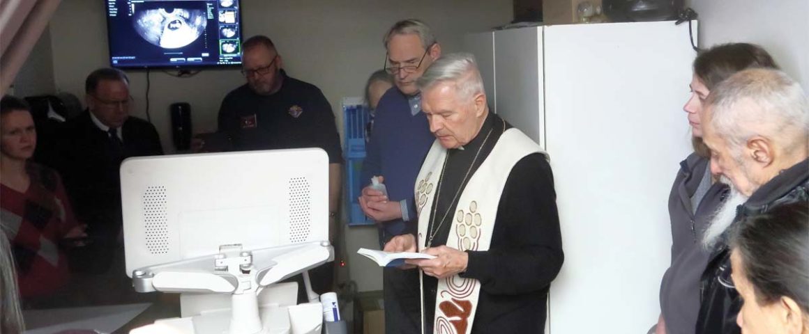 Before the blessing of the ultrasound machine, Archbishop Emeritus Roger Schwietz said, “What the Lord has said to us is that the truth shall make you free.” The archbishop continued saying, “This machine, which is an invention of human beings, is probably one of the strongest weapons we have in the truth. So we thank God for that. We thank God for the Knights who are so dedicated to providing these machines. We pray that the Lord bless this machine and those who use it.”