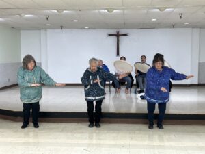 The congregation prayed the “Our Father” in Yup’ik as Gemma Gaudio and the grandchildren of Theresa and Donald Mike signed with their tegumiaks, dance fans made of feathers, fur, and other materials.
