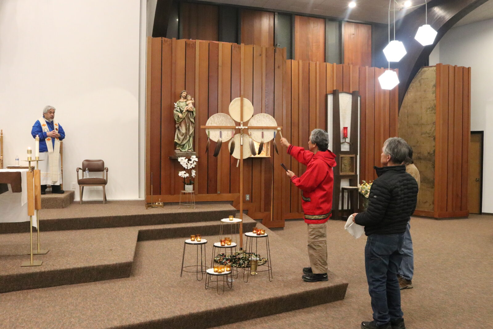 Fr. Fred Bugarin, Fr. Vince Blanco, and Fr. Tom Provinsal, S.J., from the Diocese of Fairbanks, began Mass. They followed Teddy Mayac Jr. as he processed with the Native cross and placed it in the midst of the candles.