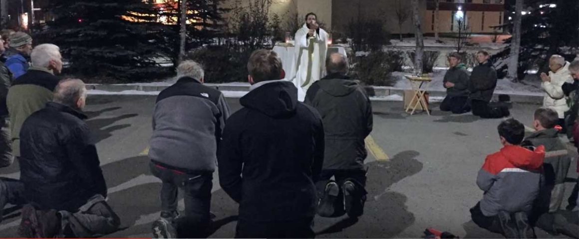 Earlier this winter, as pre-dawn Anchorage drivers passed by the gray professional building at 4001 Lake Otis Parkway, about the only sign of life outside was colored text dancing across an electric sign. Unseen was the somber celebration of a Mass in near-freezing temperature at a nearby empty parking lot.
