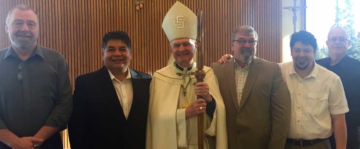Scott Gunnell of Sacred Heart Church in Wasilla; Gus Azpilcueta of Holy Family Cathedral in Anchorage; Dan Winters of St. Christopher by the Sea in Dutch Harbor; Gabriel Ruiz of Our Lady of Guadalupe Co-Cathedral in Anchorage; and Mike Hawker of St. Elizabeth Ann Seton Church in Anchorage.