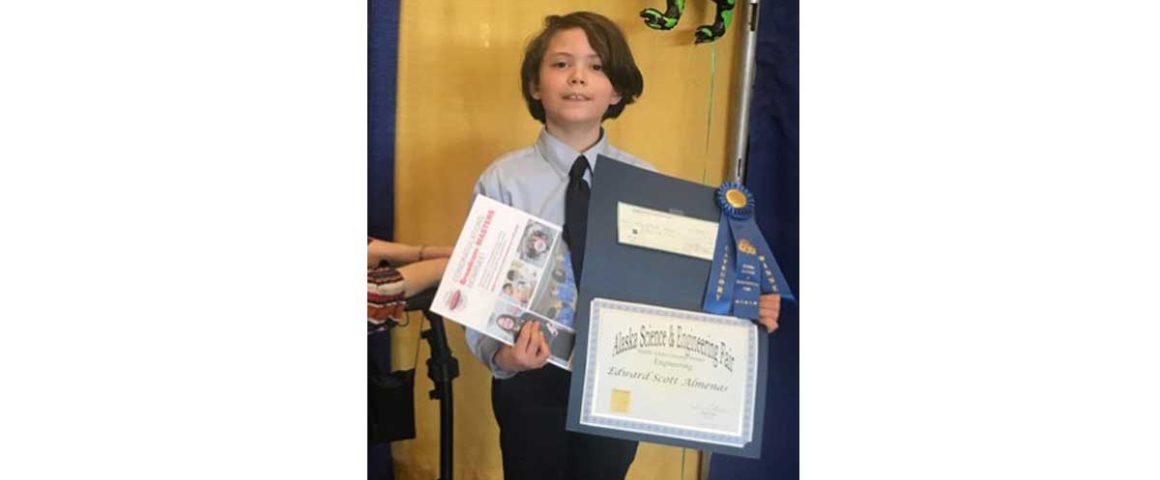 He participated in the recent Alaska State Spelling Bee and later took third place in the Alaska State Geo Bee. Most recently he placed first in his category at the Alaska Science and Engineering Fair, and was among the top ten projects overall among middle schoolers. He was also nominated to apply for a spot at the annual Broadcom Masters National Science Fair in Washington, D.C.